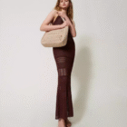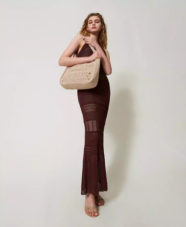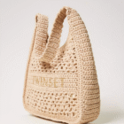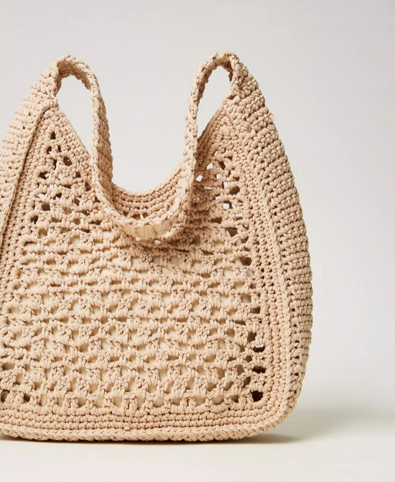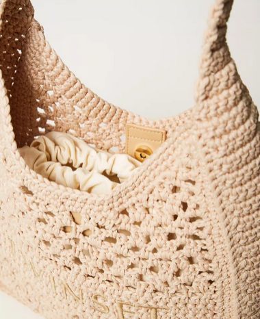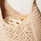 Besace avec finition crochet réalisée à la main sur une forme en bois. Elle présente une fermeture aimantée, une anse pour un porté épaule, le logo ton sur ton brodé au centre et un sac intérieur amovible en toile doté d’un cordon de serrage.