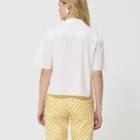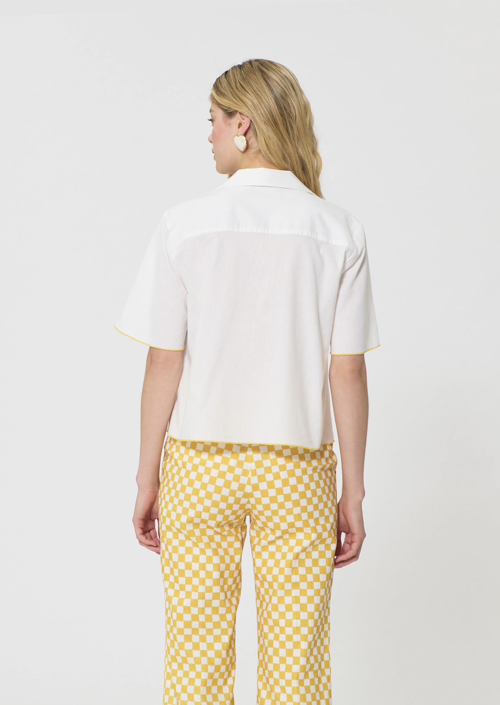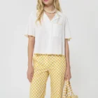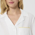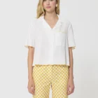 Cette chemise courte écrue en coton côtêlé possède des manches courtes et un col V à revers. Un fin liseré jaune souligne les manches, le bas et la poche plaquée à la poitrine apportant une touche de couleur à l’ensemble.
