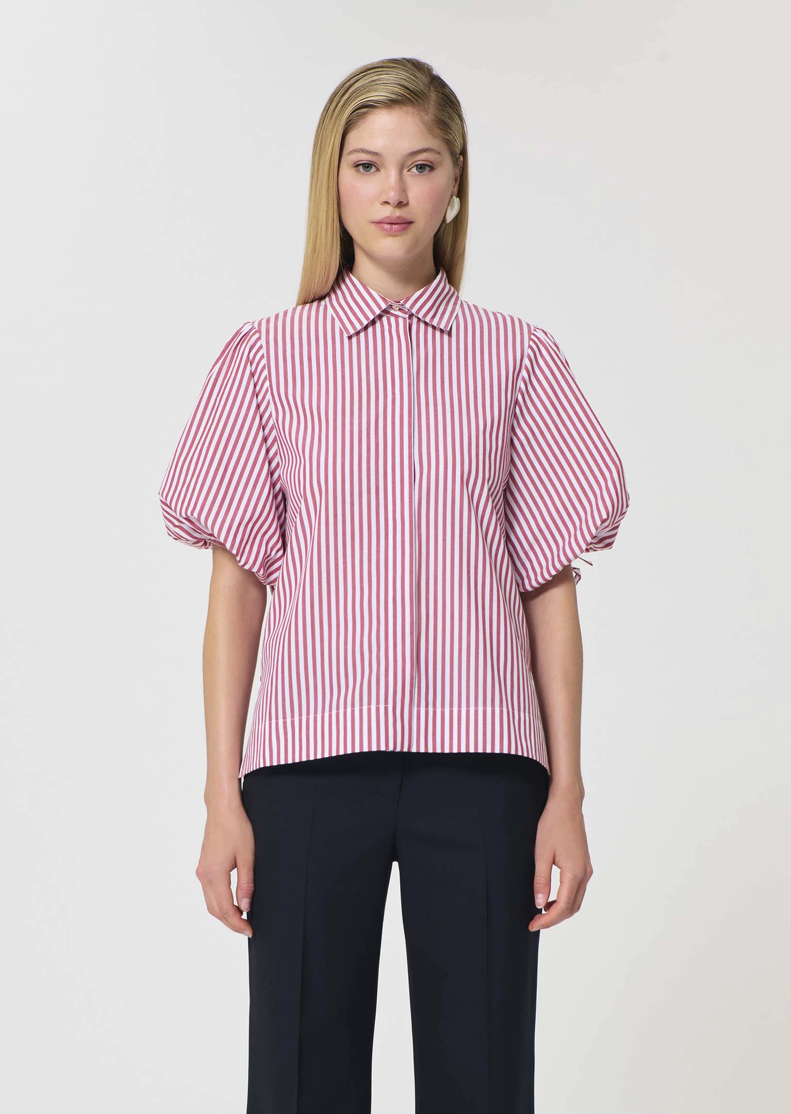 Cette chemise couleur rouge cerise Ă  rayures en popeline possĂšde des manches ballons, se nouant par de fins nƓuds ton sur ton, un col classique et une coupe droite. Elle se ferme au devant par de petits boutons dissimulĂ©s.