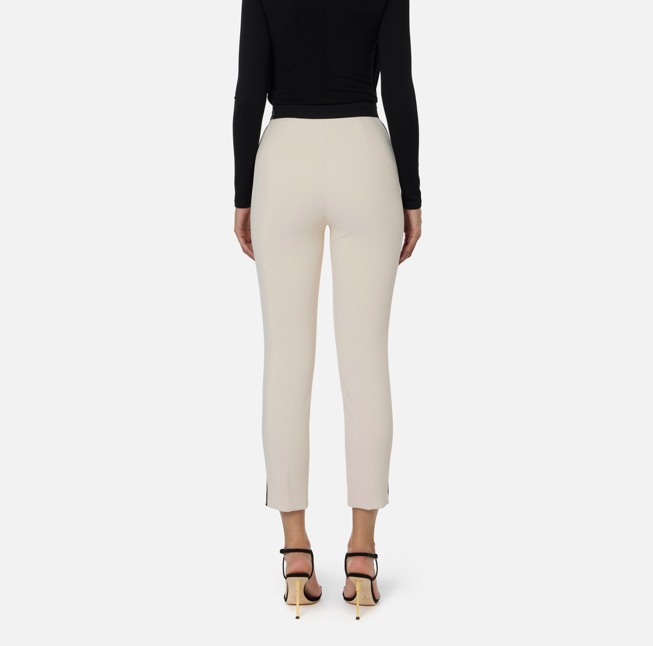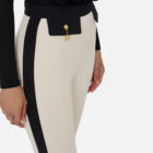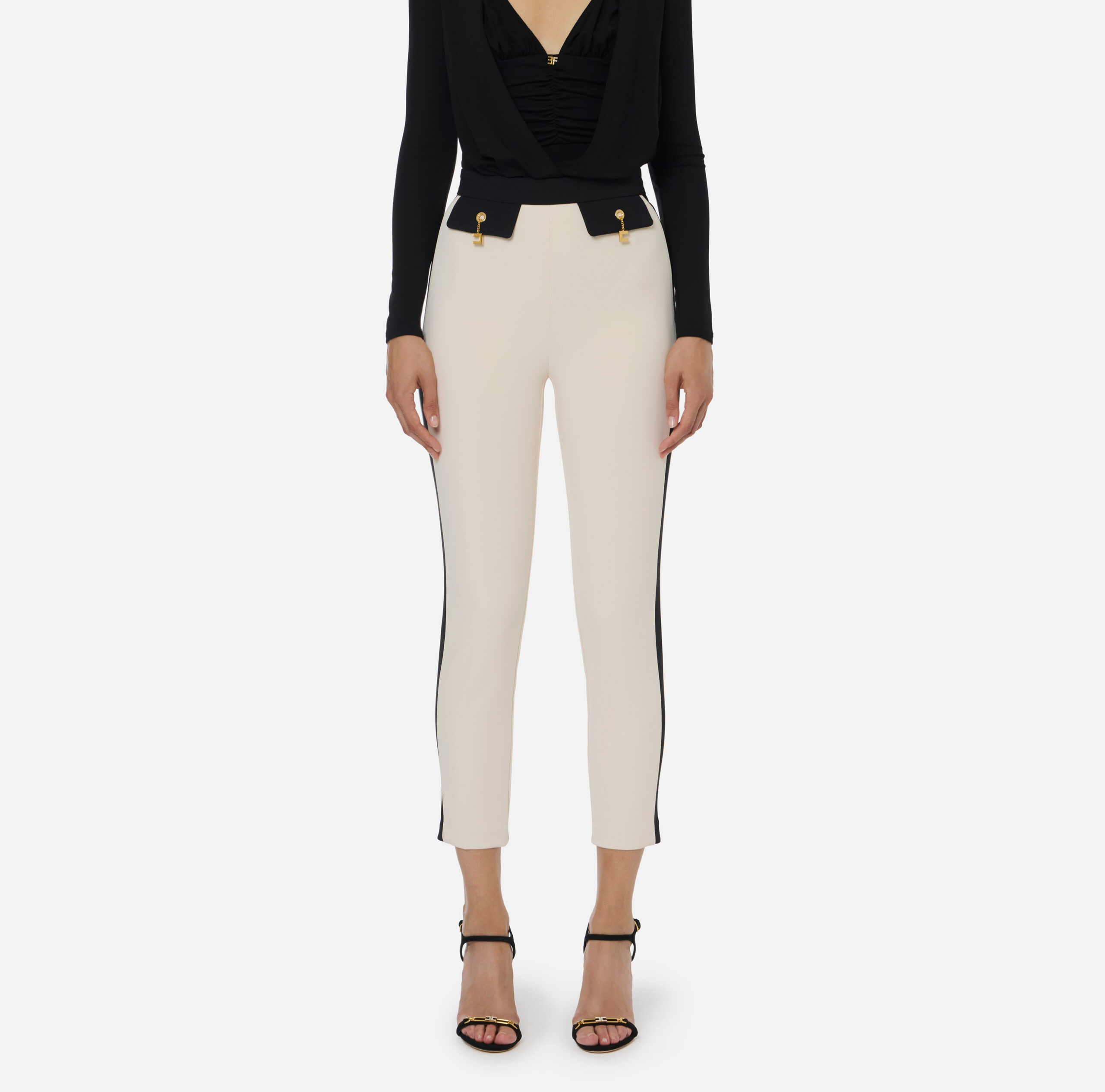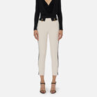Pantalon en double crêpe à la coupe ajustée. Longueur à la cheville, il se distingue par des détails en couleur contrastée qui créent un équilibre chromatique raffiné, comme la bande à la taille, les rabats et les bandes latérales. Les boutons de manchette pendentifs avec chaîne ajoutent un détail brillant.