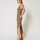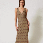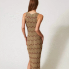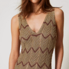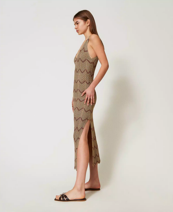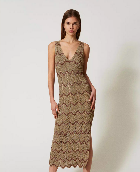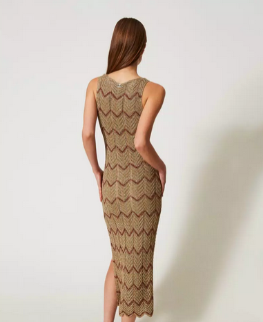Robe midi en maille mélangée de viscose et lurex avec une finition ajourée qui crée des motifs géométriques bicolores. Sans manches, elle présente une encolure en V et un bas festonnés, une étiquette siglée Oval T et une coupe ajustée.