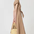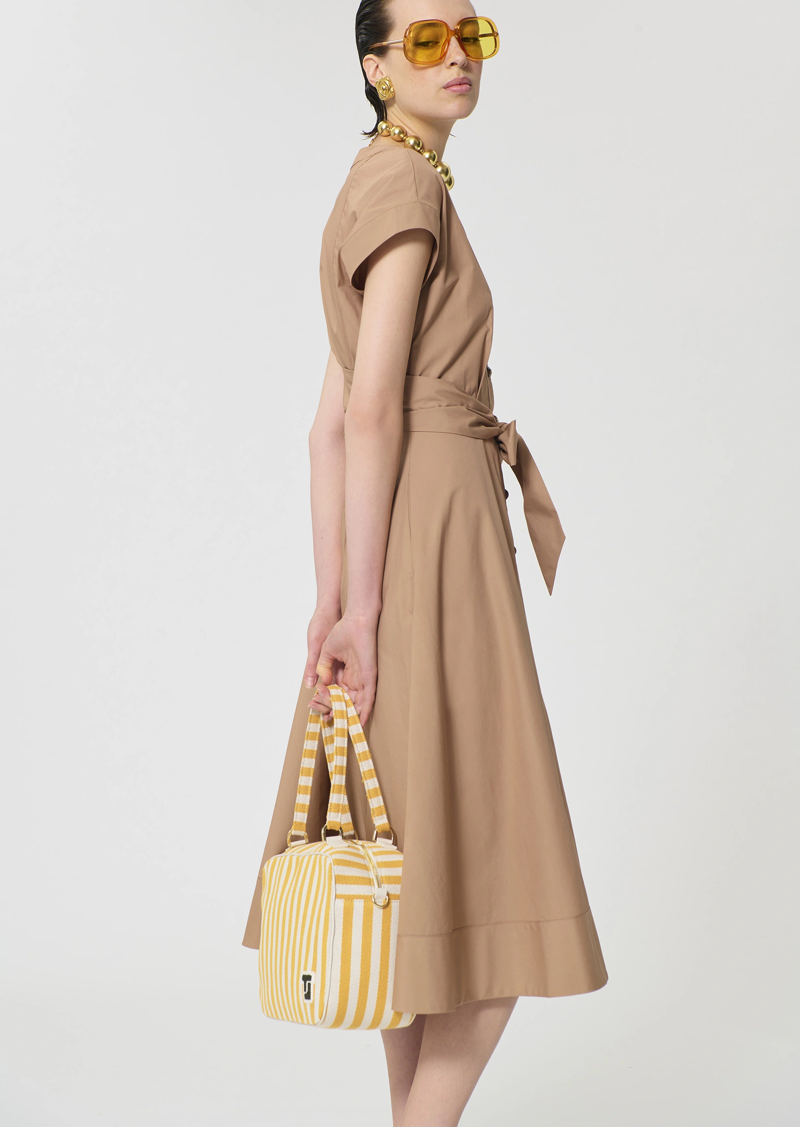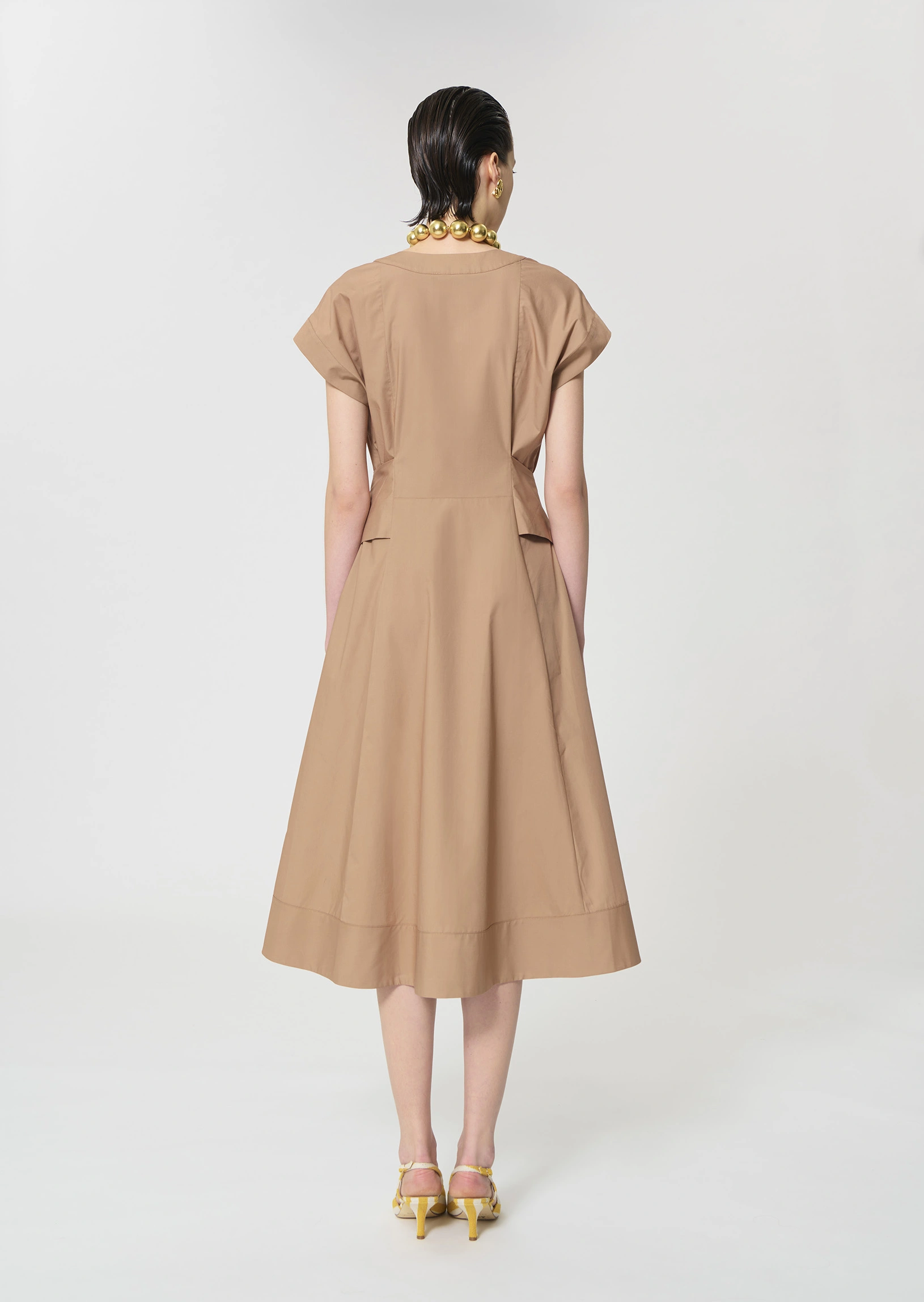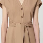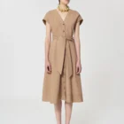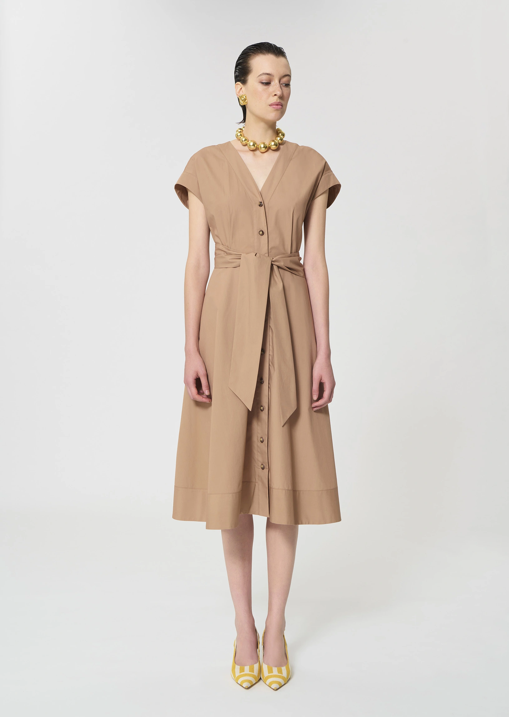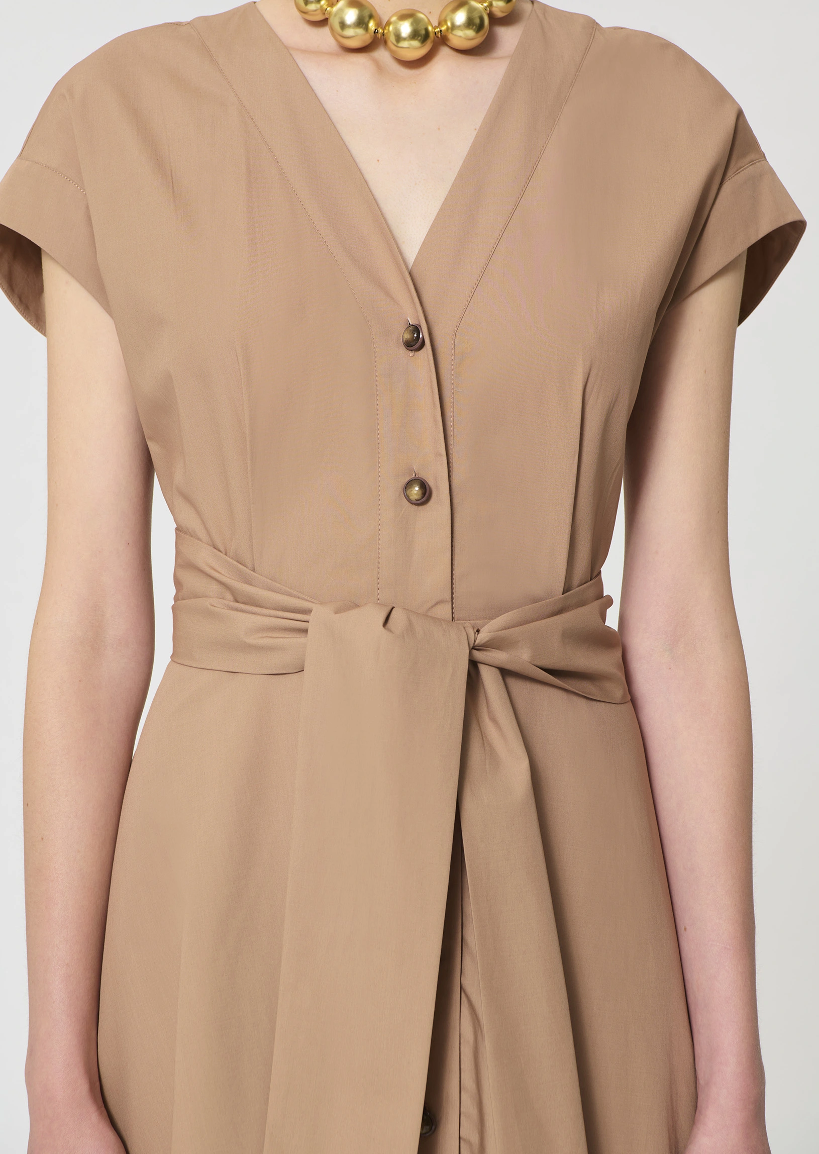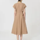 Cette robe midi en popeline couleur beige miel possÚde un col en V, des manches courtes et des poches invisibles aux cÎtés. Elle se ferme au devant par des boutons écaille. Sa jupe volantée et son lien à nouer ton sur ton ceinturant la taille lui confÚrent son look romantique.