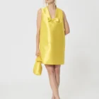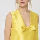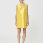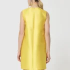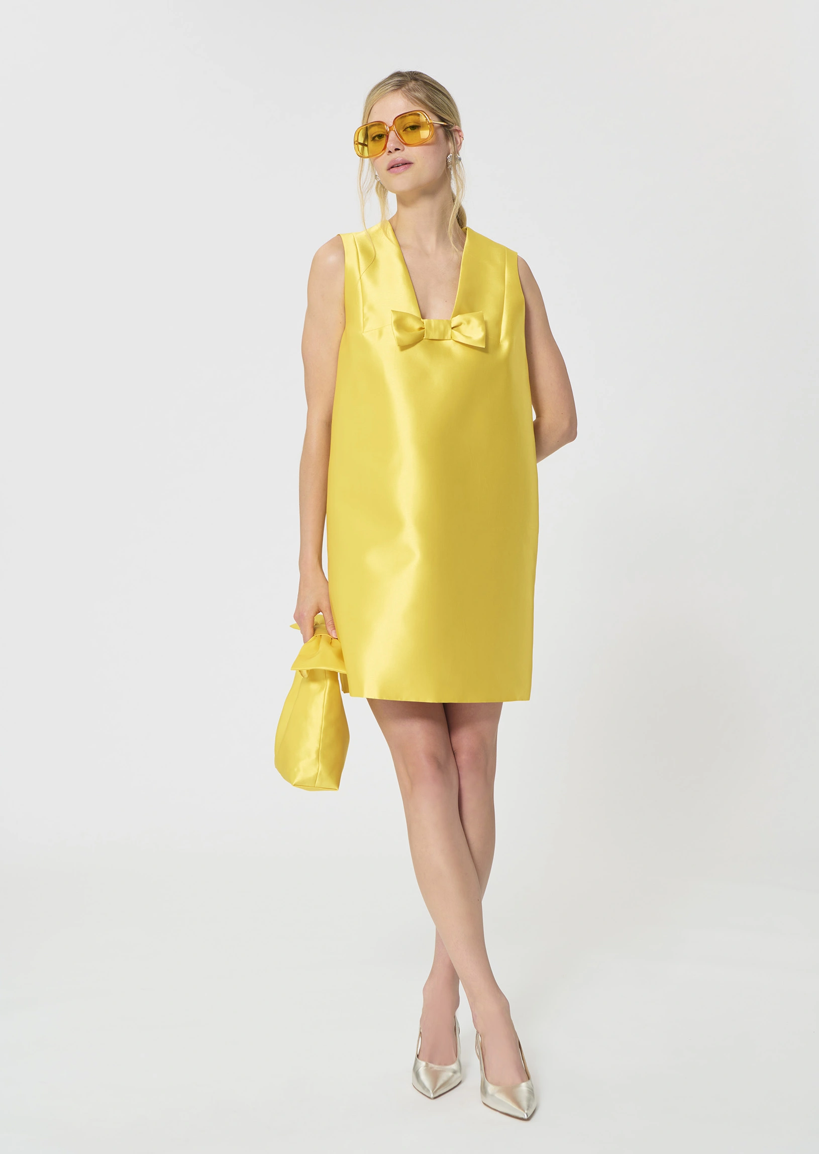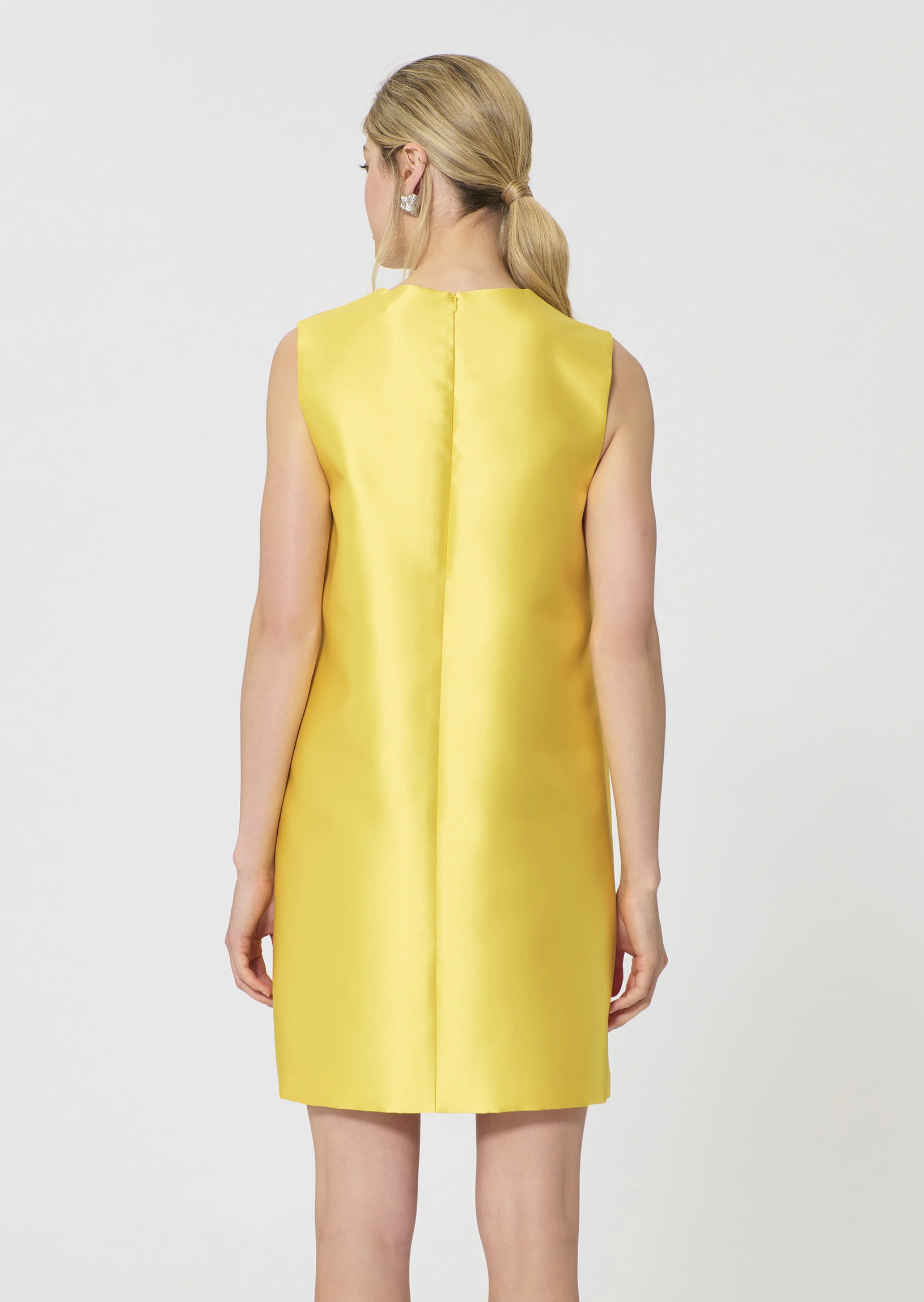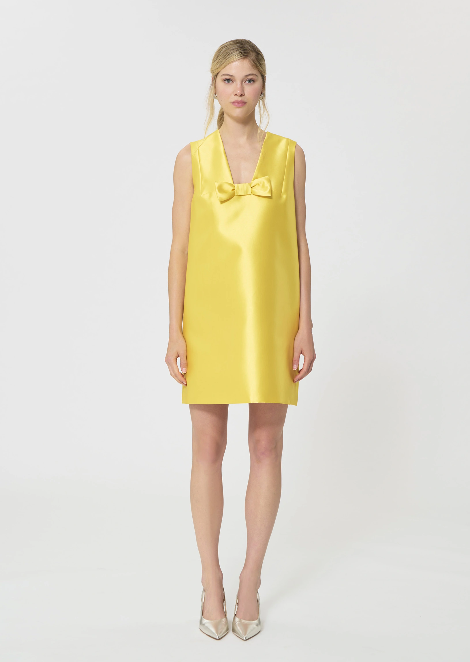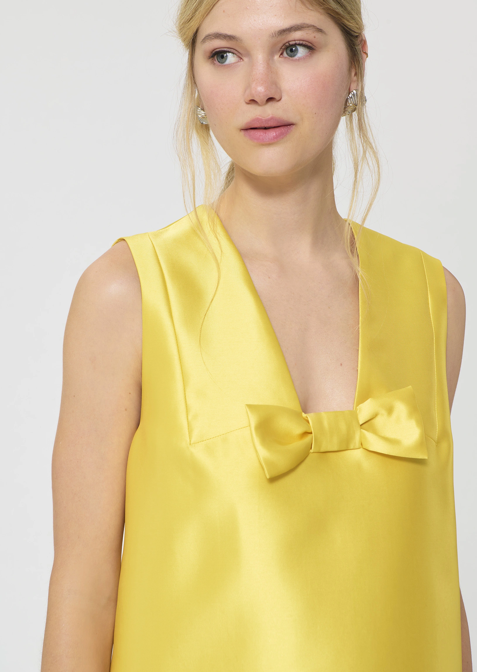 Cette robe courte couleur jaune mimosa est sans manche et possĂšde un dĂ©coletĂ© en V. Ultra lumineuse, elle est entiĂšrement confectionnĂ©e en satin duchesse. Sa coupe lĂ©gĂšrement trapĂšze est agrĂ©mentĂ©e d’un nĆud papillon Ă la poitrine. Fermeture par un zip invisible au dos.