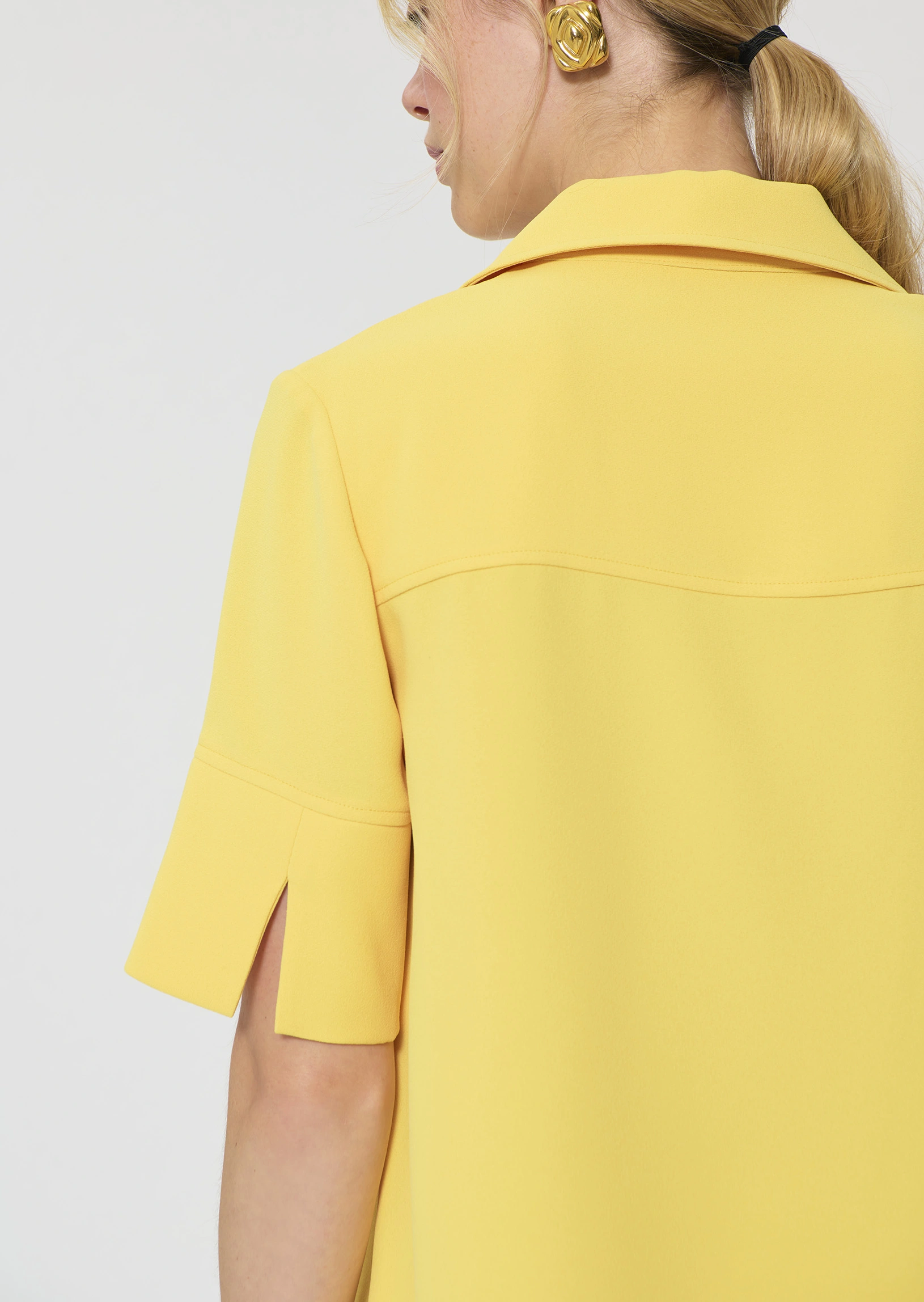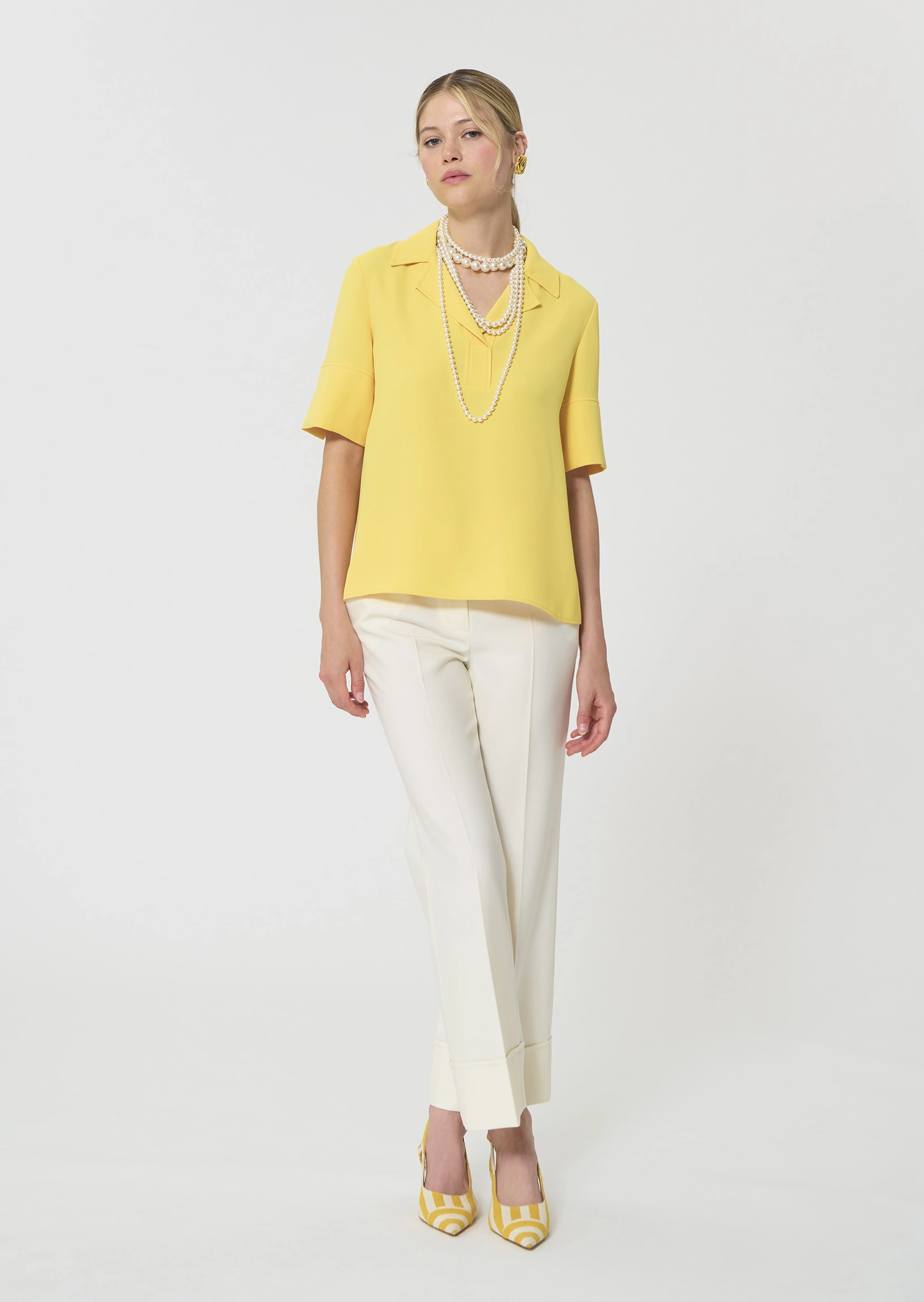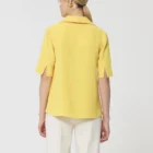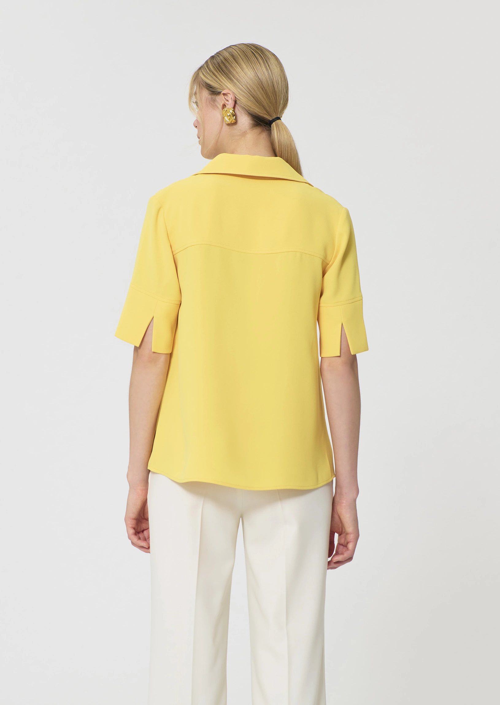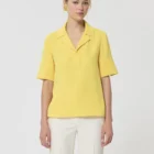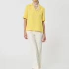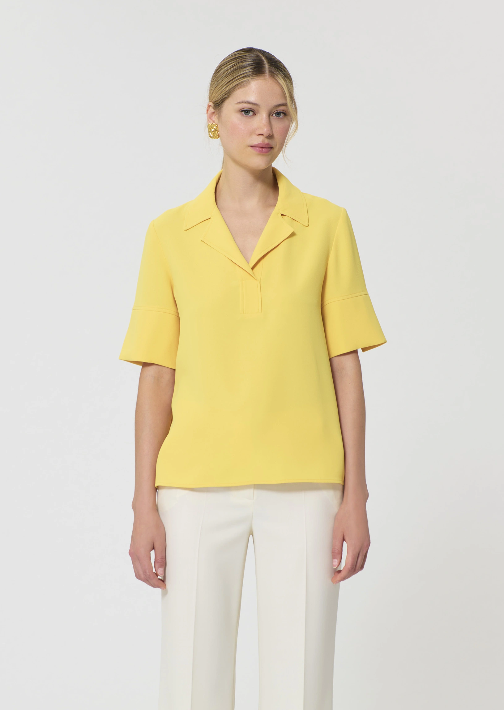 Ce top couleur jaune mimosa en crĂȘpe possĂšde des manches courtes fendues et un col V Ă revers. Sa coupe fluide est lĂ©gĂšrement cintrĂ©e. On le porte avec le pantalon Pia assorti pour un total look colorĂ©.