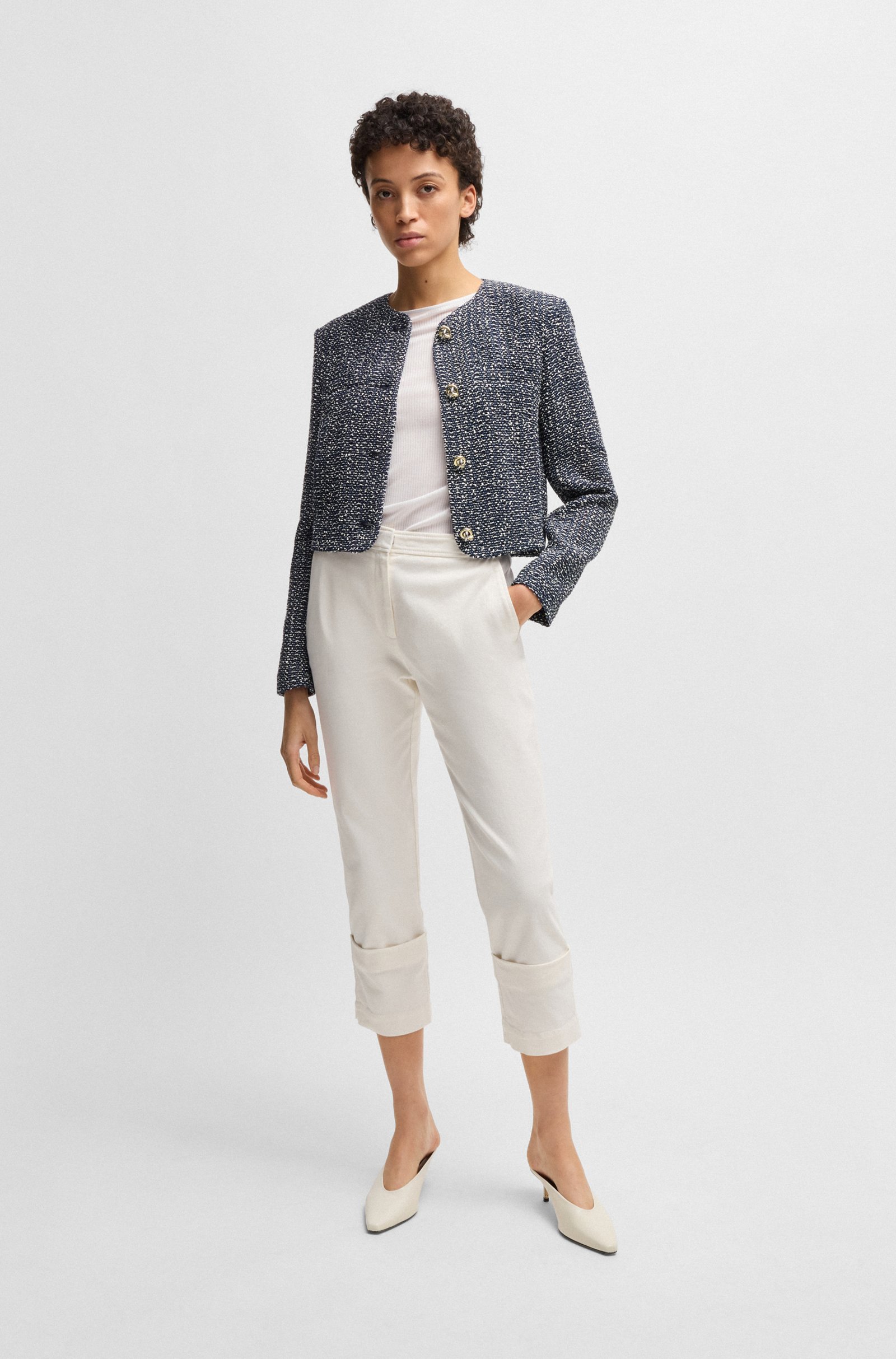 Cette veste Ă©purĂ©e BOSS Femme est une piĂšce raffinĂ©e. Le tweed bicolore est confectionnĂ© en coton doux. Boutons nĆuds dorĂ©s.